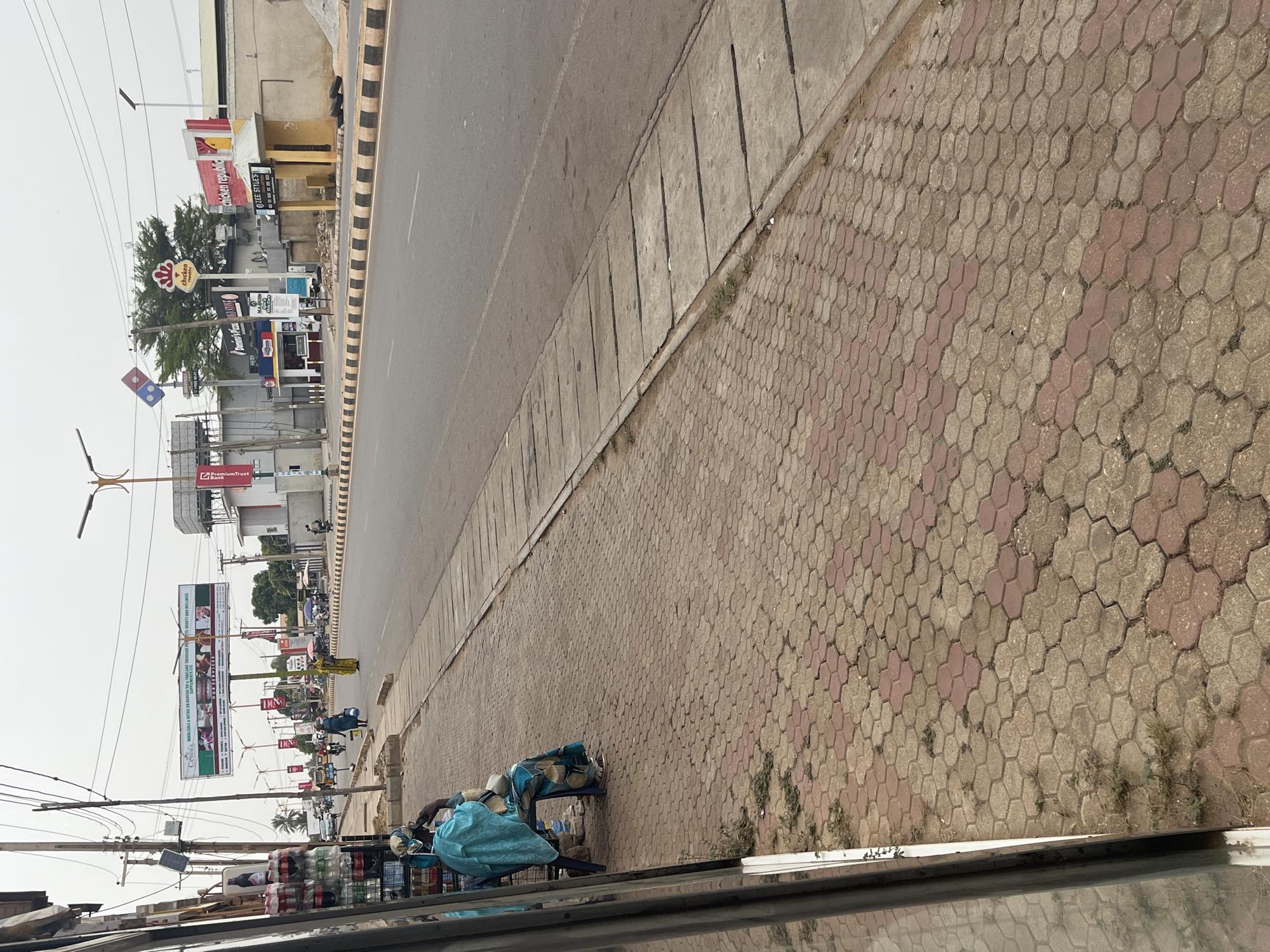 street scene in Barden Yana, Nigeria. The foreground features a tiled pedestrian walkway with a hexagonal pattern. Adjacent to the walkway is a road with a concrete divider. Across the road, businesses are visible, including Chicken Republic, Zee Styles, and a petrol station with a Total sign. Billboards and signage are also present, advertising retail, skincare products, and supplements. People can be seen walking on the sidewalk. The image captures elements of daily life in Barden Yana, displaying commercial activity along a main road.