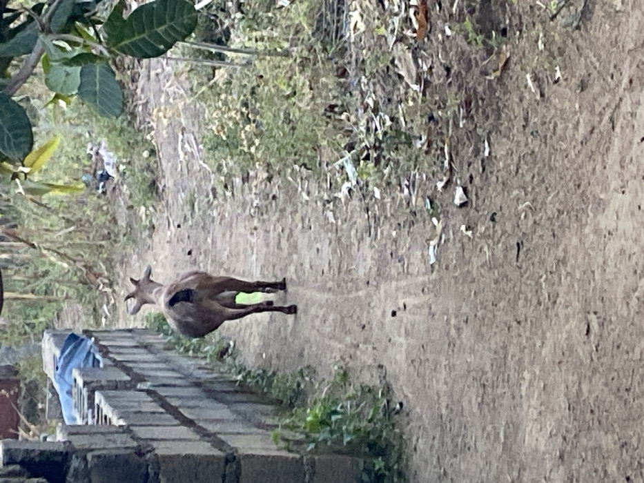 The image captures an outdoor scene in Udu, Nigeria, looking down a narrow, unpaved dirt path. A medium-sized, light brown quadruped animal, resembling a deer or small antelope with short horns and a dark marking on its hindquarters, walks away from the viewer in the center of the path. To the left, a partially constructed grey concrete block wall runs alongside the path, with a crumpled blue tarp visible beyond it. The right side of the path is lined with dense, unkempt vegetation, including green foliage and dry brush, intermingled with scattered refuse such as white and dark plastic debris. The dirt path itself displays subtle depressions, possibly from foot traffic or vehicle tires.