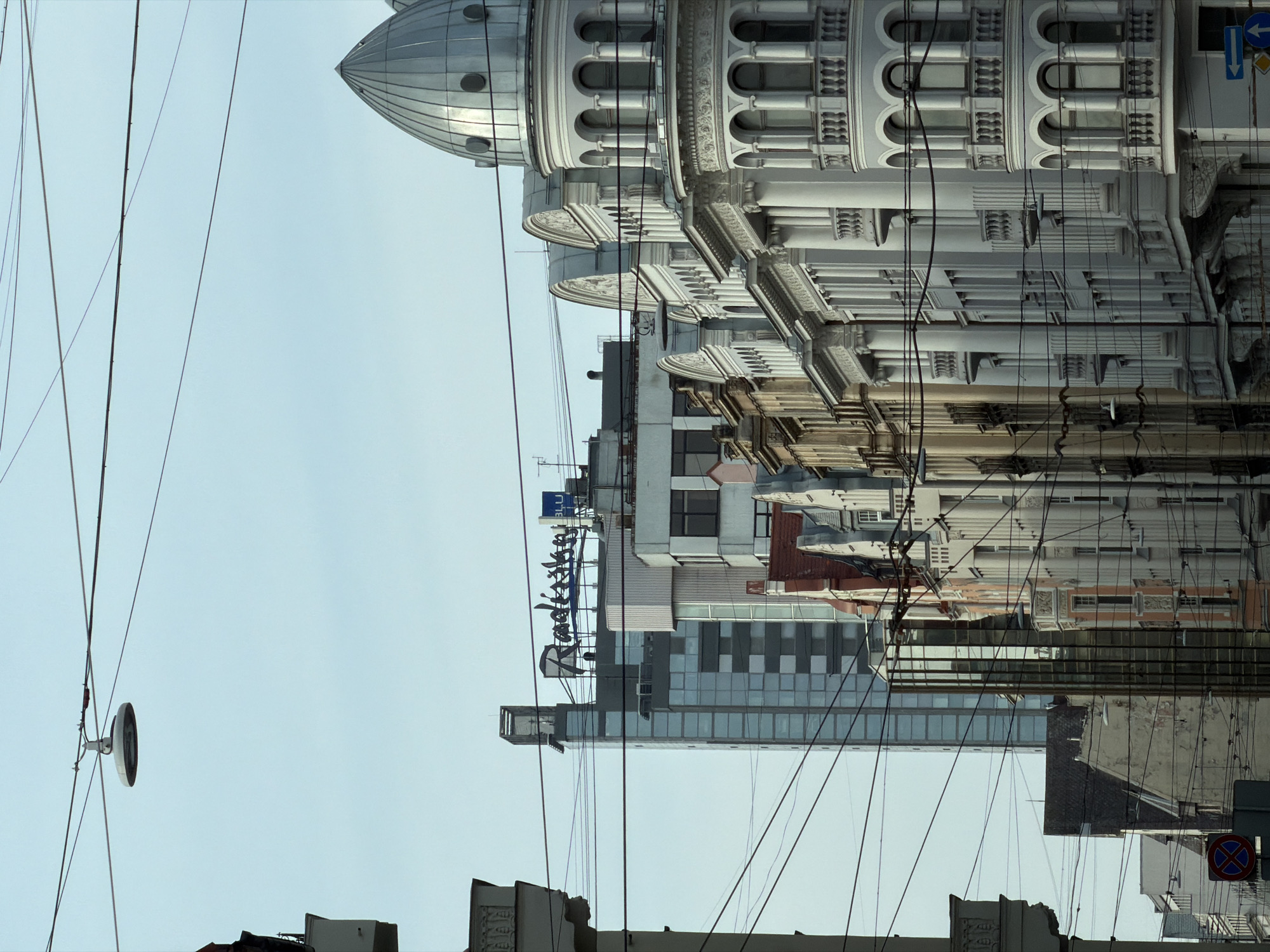 cityscape in Riga, Latvia, specifically the Art Nouveau architecture of Alberta iela (Alberta Street). The photograph is oriented upside down. The dominant architectural feature is a building with a distinctive dome and ornate facade, characteristic of the Art Nouveau style. Power lines crisscross the sky, obscuring portions of the buildings. In the background, modern buildings can be seen. A street lamp and road signs are also visible.