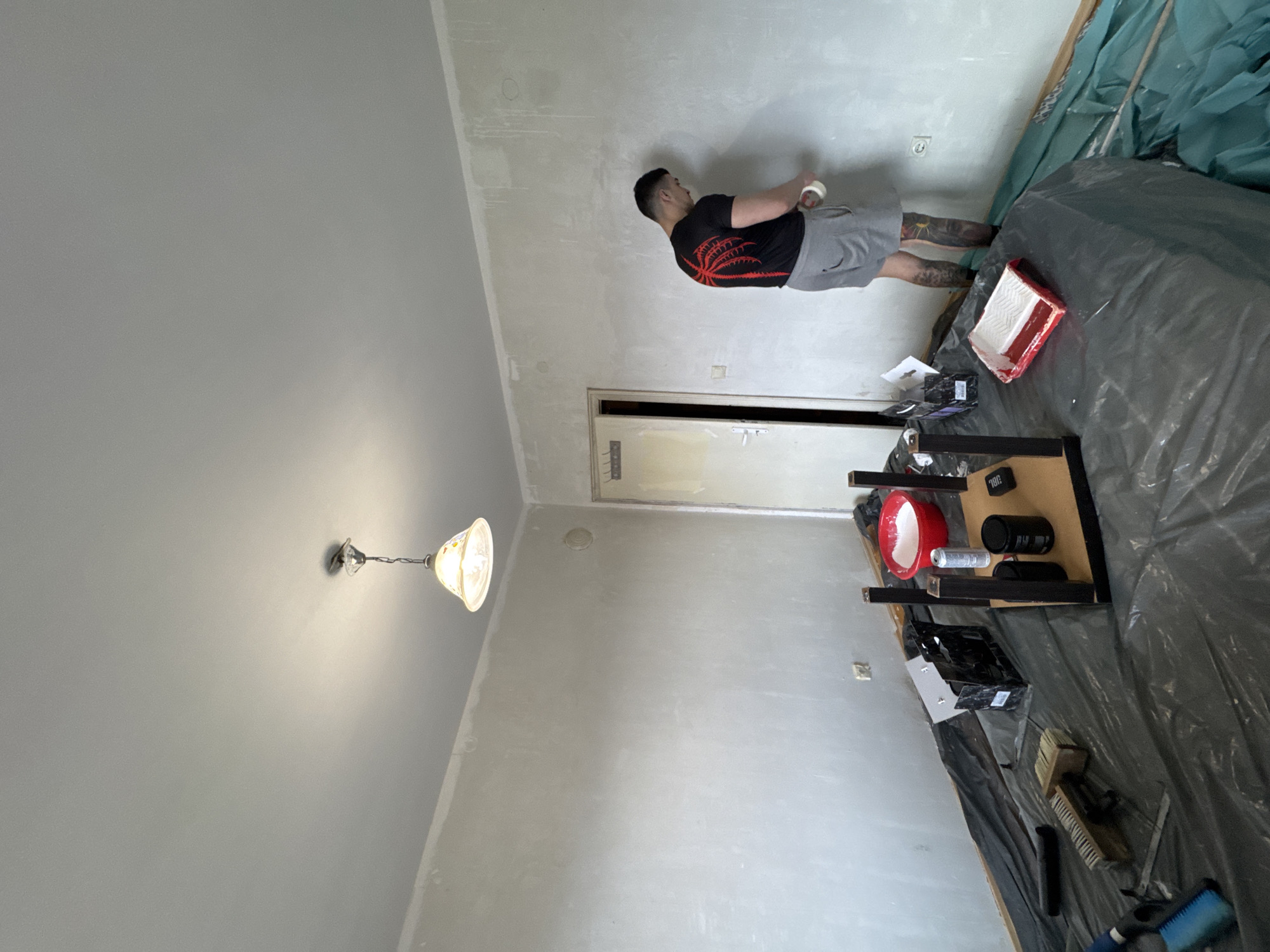An indoor scene reveals a man in a black shirt with a red palm tree design on the back, gray shorts, and tattoos on his legs, applying painter's tape to a wall. The walls are light gray and appear to be freshly plastered, with some areas still showing patches. A door is visible in the background. A table covered in a black plastic sheet holds painting supplies, including a red paint bucket, rollers, brushes, a paint tray, and what appears to be a JBL speaker. The floor is also covered with the same black plastic sheet. Overhead is a decorative light fixture with a partially visible lampshade. The location of the scene is likely Sofia, Bulgaria.