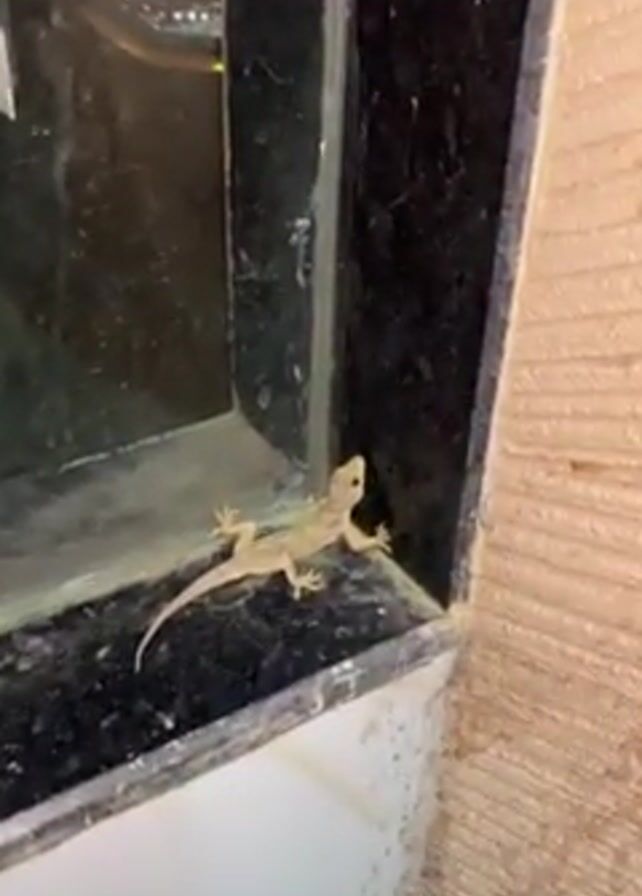 A close-up shot shows a small, tan-colored gecko clinging to the edge of a window frame