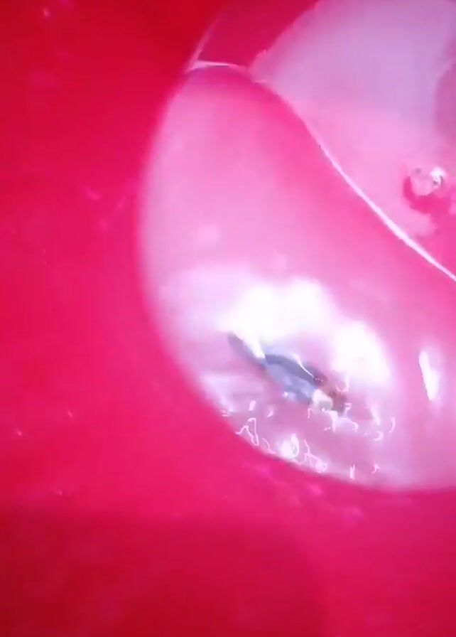 small black beetle with orange markings trapped in a red bucket filled with water. The beetle is struggling to move in the water. The video focuses closely on the beetle and the bucket.