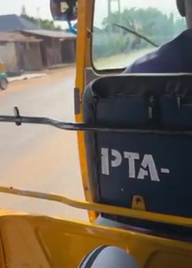 From the interior of a moving yellow auto rickshaw, a seated passenger with gray sweatpants is visible. The passenger faces forward, toward the driver, who wears a dark purple shirt. The back of the driver's seat reads "PTA - 5". Through the windshield, a partially obscured street with buildings, foliage, and another auto rickshaw can be seen.