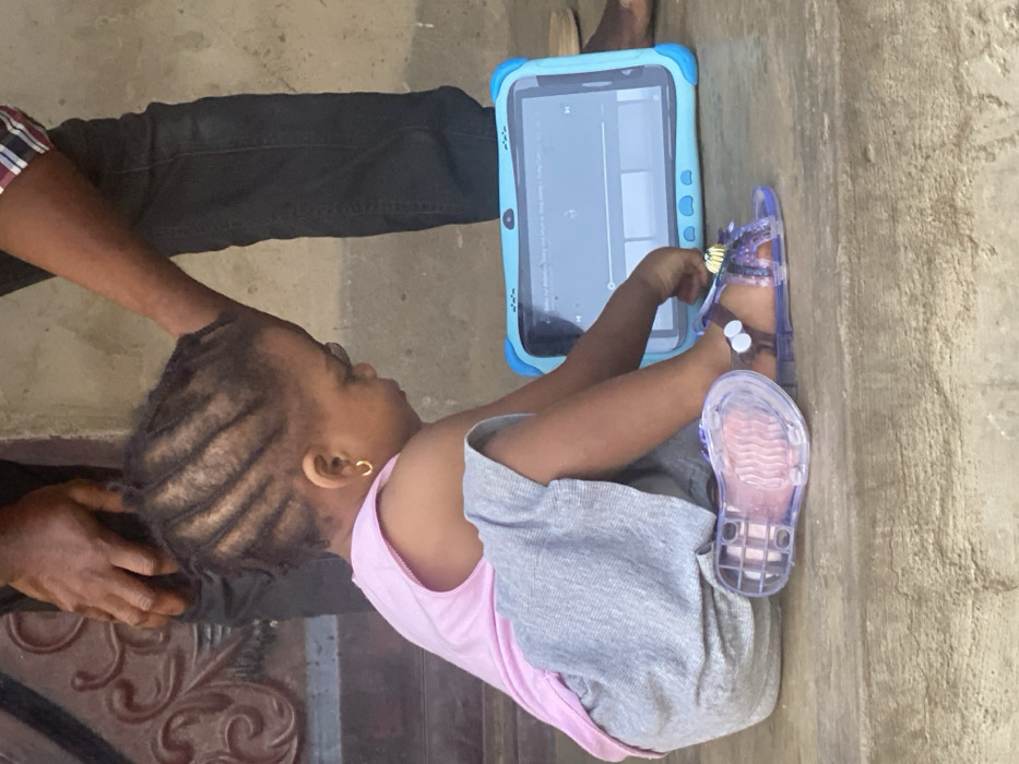A young child sits on a concrete surface wearing a pink and gray outfit, with braided hair and a gold earring. The child is holding a pair of translucent purple sandals. Beside the child is a blue-framed tablet displaying a video or other visual content. An adult's arm and leg are visible, suggesting the child is sitting beside them.