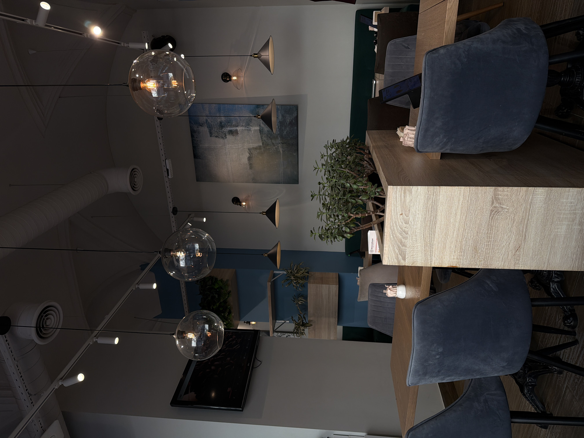 The image displays the interior of an unoccupied modern dining establishment, located in Saint Petersburg, Russia. The environment features a high ceiling with exposed white ventilation ducts and multiple track lights, along with various pendant fixtures. Three large, clear spherical pendant lights with visible filaments are centrally positioned, complemented by several smaller black cone-shaped pendant lights and wall-mounted fixtures with clear glass shades. The walls are predominantly light gray. A distinct vertical blue accent panel is visible on the left side of the room, featuring two light wooden shelves that hold potted plants. To the left of this panel, a black flat-screen television is mounted on the light gray wall. On the far right wall, a large abstract painting with blue and white tones is hung. The flooring is dark. The furniture includes light wooden tables supported by dark, ornate metal bases, paired with dark gray velvet upholstered chairs. A continuous green upholstered bench seat lines the far wall. A light wooden partition, functioning as a planter, runs through the central foreground, topped with a substantial green Crassula ovata plant. Table accessories visible include small white condiment dispensers and a digital tablet in a black case resting on a table further back. No individuals are present in the scene.