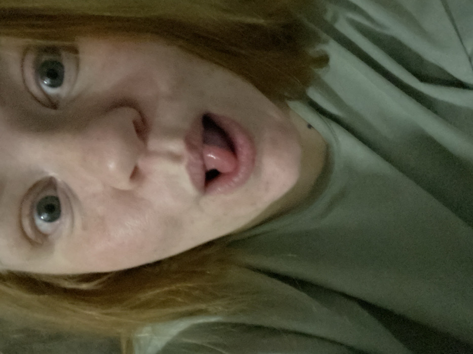 A close-up, tilted shot captures a person's face with their mouth open, tongue partially protruding. The individual has fair skin, freckles, and light-colored eyes. Their hair is a shade of reddish-brown. They wear a dull green top. The lighting is muted, lending the image a slightly somber tone. The camera's perspective exaggerates certain features, particularly the eyes and nose.
