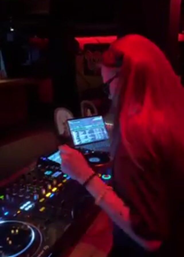 A woman with long red hair is DJing at a nightclub. She is wearing glasses and a black shirt and has a bracelet on her right wrist. She is working on a professional-looking DJ setup with Pioneer CDJ turntables and a laptop. The DJ table is illuminated by the equipment's built-in lights. The room is dimly lit, with red lighting casting a moody vibe. In the background, two women are dancing in front of a bar. The bar is well-stocked with bottles and glasses. Other people can be seen in the background, suggesting a busy and lively atmosphere.