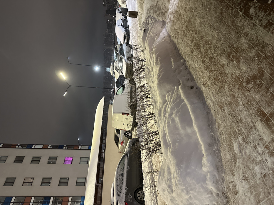 A nighttime scene reveals snow-covered cars parked near a building. Streetlights illuminate the area, highlighting the textures of the accumulated snow on the ground. A building with several windows, one of which emits a purple glow, stands in the background. The composition is oriented vertically, emphasizing the height of the building and the depth of the parking area. Bare branches emerge from the snow, creating a contrast between the natural and man-made elements.