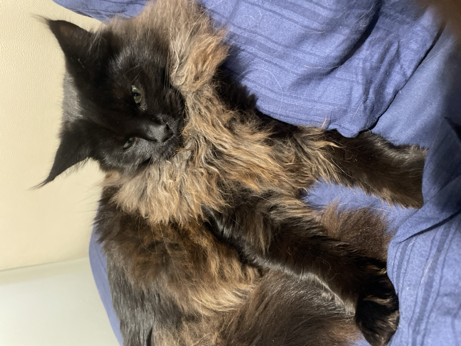 - "A long-haired cat with primarily black fur and prominent brown/ginger undertones, particularly around its neck forming a distinct ruff, is depicted resting on dark blue, striped bedding" by FM-HSuMn2, licensed under CC BY 4.0
