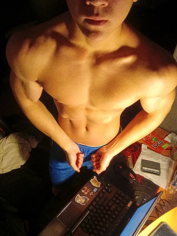 A muscular, shirtless person is captured from an overhead angle. They have a defined chest, shoulders, and abs. The individual is wearing blue shorts or underwear. Below, a desk is cluttered with a laptop adorned with stickers, a keyboard, a container of M&Ms, a mousepad, and a wallet, implying a personal space. The lighting is warm, highlighting the person's physique, while the background is dark and out of focus.