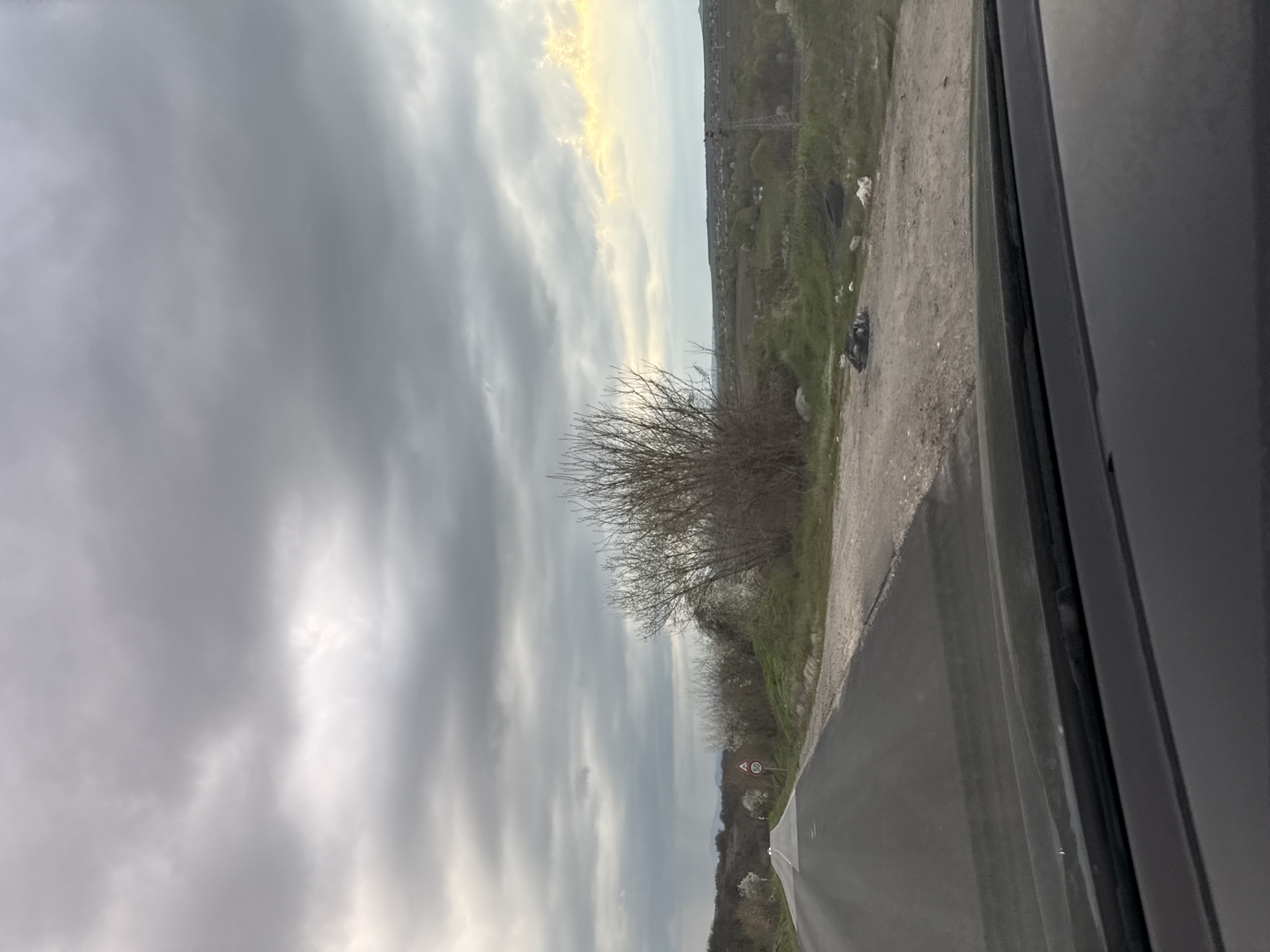 view from inside a vehicle, likely a car, looking out over a rural roadside in what is assumed to be Dobrich, Bulgaria. The road is asphalt, and the shoulder is gravel and grassy with sparse vegetation. A leafless bush is prominent on the right side of the road. The sky is overcast with gray clouds. A speed limit sign is visible along the road. The vehicle's window frame is visible on the right edge of the image.