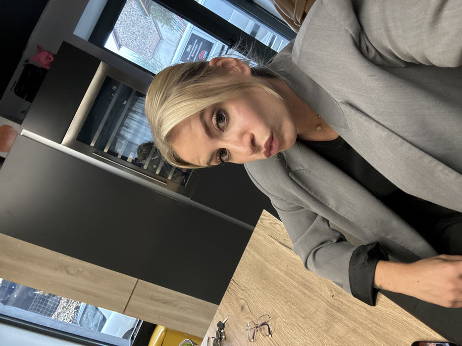 The image depicts an adult female indoors, taking a selfie. She has blonde hair, styled partially up with bangs, and is wearing a light grey blazer over a black garment, adorned with a subtle necklace. Her lips are pursed forward in a 'duck face' expression, and she looks directly into the camera. Her left forearm, with a cuffed blazer sleeve revealing black lining, rests on a light-colored wooden table with a visible grain. On this table, a set of keys with a black fob and a pair of thin-framed eyeglasses are present. The background features modern cabinetry in dark grey and light wood tones. An integrated stainless steel appliance, resembling a wine cooler with a glass door and visible shelves, is set within the cabinetry. A small pink object rests on the top of the cabinetry above the appliance. To the right, a large window provides an exterior view of a white commercial van partially displaying the text "DMS SAINT-MÉDARD Fers" and "Electricité". Beyond the van, a building with stone-like siding and a tiled roof is visible. This context identifies the general location as Saint-Médard-en-Forez, France. The scene is illuminated by a combination of indoor lighting and diffused natural light.