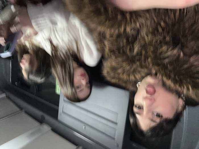 Three young women pose close together, possibly on a bus. The woman on the right wears a large, furry brown coat. She sticks out her tongue. The woman in the middle wears a white top and looks directly at the camera. The third woman, on the left, has dark hair and is partially obscured. The background suggests a vehicle interior with metal panels and a window. The image has poor lighting and is slightly blurry.