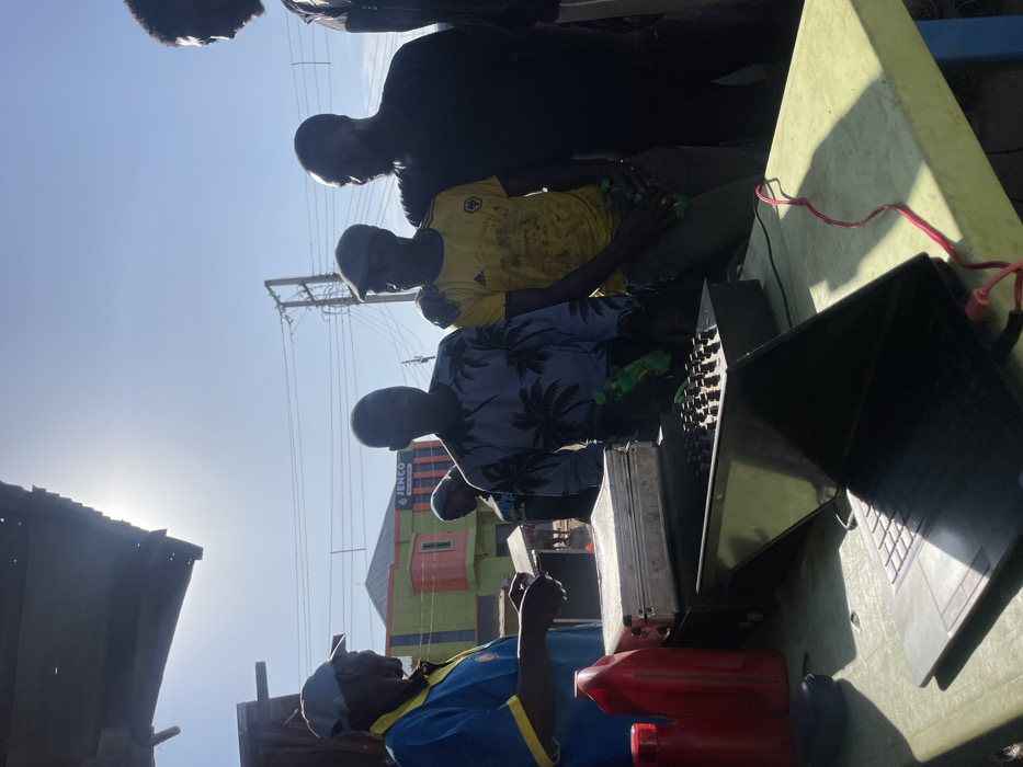 The image depicts an outdoor scene in Hwolshe, Jos, Nigeria, under bright midday sunlight, evident from strong shadows and direct glare. In the foreground, a light-colored table supports electronic equipment. From left to right on the table: two red plastic containers, a silver-colored rectangular equipment case, a black audio mixer with multiple knobs, and a partially open black laptop connected by a red audio cable. Five adult males are present. On the left, an older male wearing a blue and yellow polo shirt and a grey baseball cap stands, holding small, flat, paper-like items over the table. Next to him, a male in a light-colored, long-sleeved shirt with a black palm tree pattern holds a green bottle. To his right, another male in a dirty yellow t-shirt with a black logo and a dark flat cap holds two green bottles. A fourth male in a black t-shirt stands with his right arm around the shoulder of the man in the yellow shirt. A fifth male is partially visible on the far right. The faces of the four men on the right are heavily shadowed. The men are gathered around the table, observing the equipment. The man on the far left appears to be interacting with items on the table or engaging in a transaction. The background features a multi-colored building (orange, blue, and pink/peach sections) with a prominent "JENCO" sign. Utility poles and overhead electrical wires are visible against the clear sky. A corrugated metal roof overhangs the scene from the upper left.