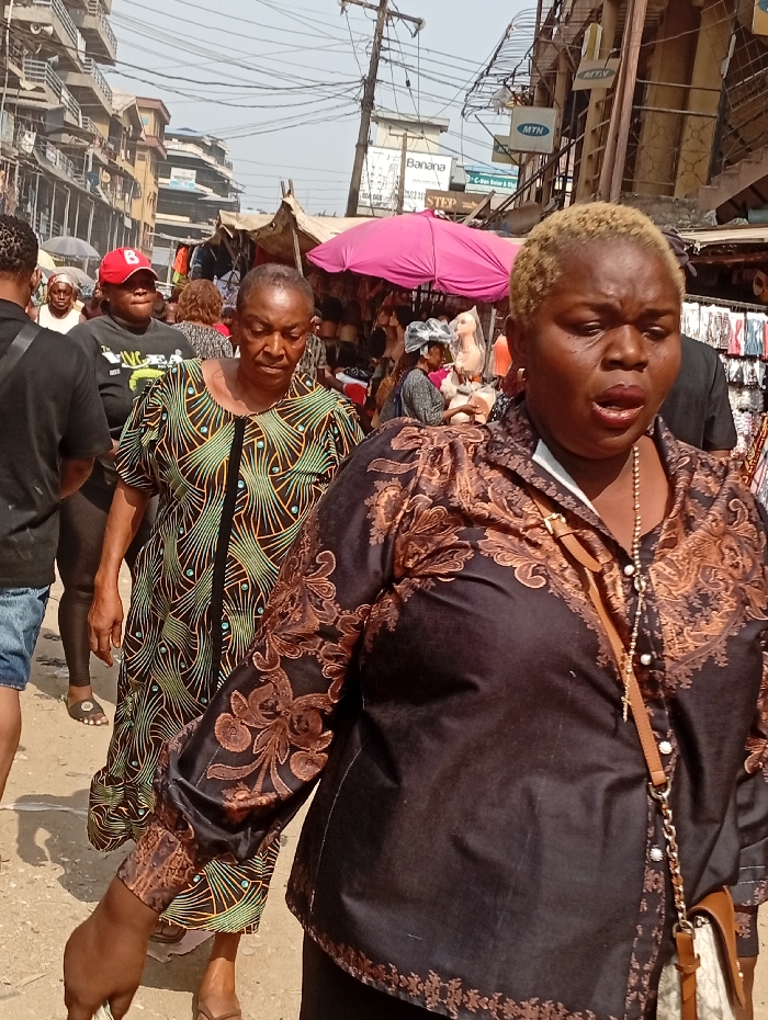 A busy street scene features several people walking amidst stalls and buildings. In the foreground, a woman with blonde hair wears a dark blue and brown patterned shirt. Behind her, another woman wears a patterned dress in green and brown. A person in a red cap and a black t-shirt stands in the background. Overhead, power lines crisscross. Signage from "MTN" and "Banana" are visible on the surrounding buildings. The general ambiance suggests a market or commercial area.