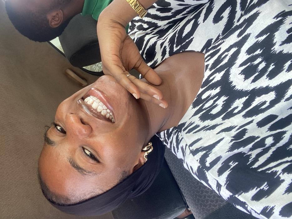 The image displays a close-up of a woman in the foreground, seated inside a vehicle, captured in what appears to be a selfie. The woman has medium-brown skin, dark hair neatly covered by a black headscarf, and a wide, open-mouthed smile, revealing white teeth and glossy lips. Her visible left ear is adorned with a gold-colored, wavy or serpentine-shaped earring. She wears a black and white garment featuring an abstract or animal print. A thin, plain band ring is visible on her left ring finger, and a gold-toned wristwatch with a link bracelet is on her right wrist. Her left hand is positioned with slightly curled fingers resting below her jawline. To her right, in the upper background, a portion of a second individual is visible, showing dark hair, a right ear, and a green collared shirt, seated in an adjacent grey upholstered car seat. The vehicle's interior background includes a light brown ceiling or headliner and a visible overhead grab handle. The scene is located in the city of Abobo, Nigeria.