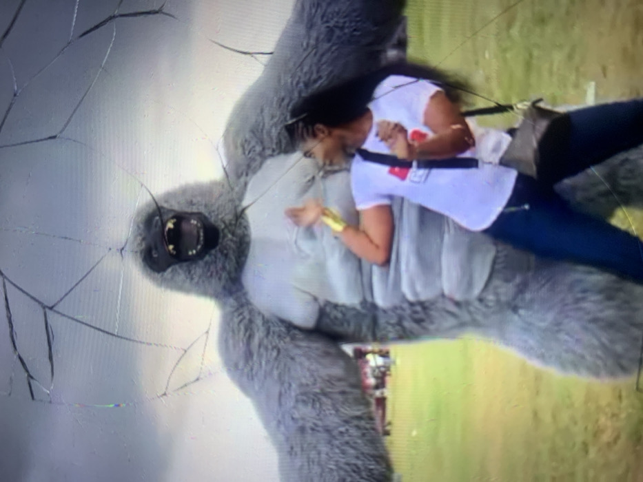 The image depicts an outdoor scene in Ijegun, Nigeria, featuring a large gorilla mascot and a woman. A massive, grey, furry gorilla costume with a lighter grey chest stands prominently in the left and central background. Its dark face features an open mouth, revealing teeth, consistent with a roaring or aggressive posture. A woman is positioned in the right foreground, wearing a white short-sleeved t-shirt, dark blue jeans, and a dark shoulder bag across her body. She has long dark hair and a gold-colored arm cuff on her right forearm. Her right arm is raised, and her head is turned towards the gorilla, indicating direct engagement with the mascot. The environment consists of a grassy field. In the distant background, blurred human figures and indistinct red and brown structures are visible under an overcast sky, suggesting a public outdoor event. The image itself exhibits numerous distinct cracks across its surface, along with minor vertical color streaks, indicating it is a photograph of a damaged display or a physical print.