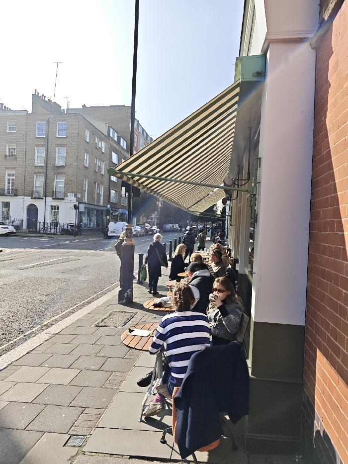 The image depicts an outdoor cafe scene on a sunny day along Church Row NW3, Hampstead, London, United Kingdom