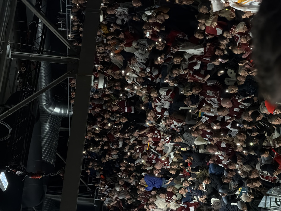 A large crowd fills a dark arena. Many people hold up phones, their screens illuminating their faces. Most wear burgundy and white jerseys. Above, exposed ductwork and structural beams contrast sharply with the crowd. The overall impression is a sense of unified support in a low-light setting.
