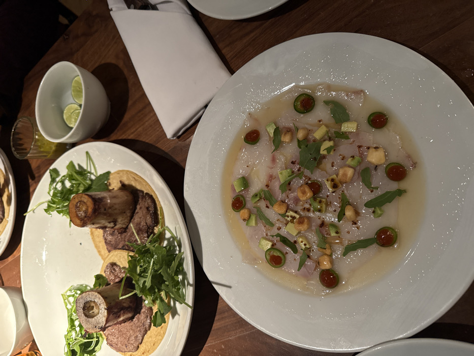 Two plates of food are displayed on a wooden table, along with a bowl of limes and a neatly folded white napkin. One plate holds what appears to be beef served on tortillas with arugula, accented by marrow bones. The other plate presents a dish featuring thinly sliced white fish, possibly carpaccio or ceviche, garnished with avocado, herbs, and chili oil. A small glass with yellow liquid and a half-filled small white bowl rest near the edge of the table.