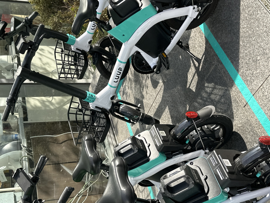 - "Two "Luup" branded, white and teal e-bikes are parked on a paved surface marked with a teal line" by FM-88vbl1, licensed under CC BY 4.0