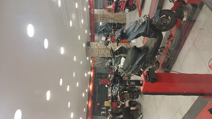 This image depicts an indoor motorcycle and scooter service center located in Eyüpsultan, Turkey