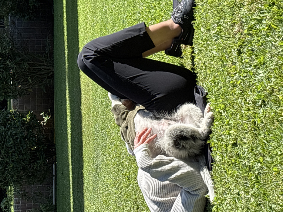 In an outdoor setting in San Juan del Río, Mexico, a person is partially visible lying on their back on vibrant green grass, with knees bent and feet flat, wearing black athletic pants and black ON Cloud brand sneakers. Their torso is clad in a light-colored ribbed knit sweater, and a hand rests on the belly of a small to medium-sized dog. The dog, with shaggy grey and white fur, is lying on its back with its abdomen exposed, positioned between the person's legs, appearing relaxed on a dark fabric surface. The background features a low, dark-toned block wall topped with dense green foliage and trees, illuminated by bright sunlight.