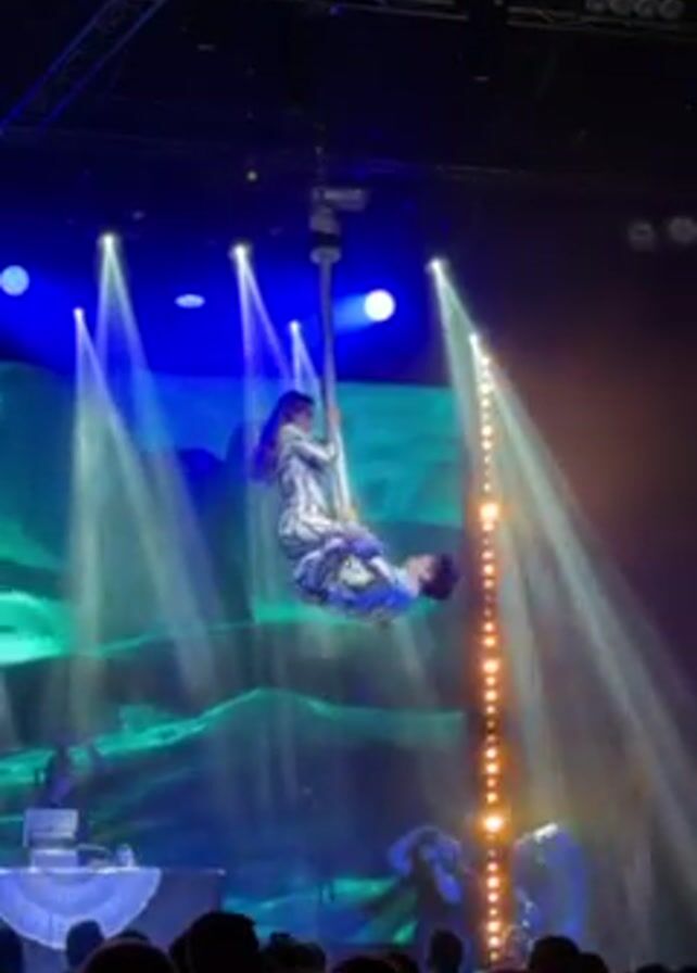 Two aerialists perform a routine suspended from fabric silks on a stage. They wear white and blue striped costumes. Stage lighting includes bright spotlights and a backdrop of what looks like a green ocean scene. The audience is in the foreground, partially obscured by silhouettes. A DJ setup is visible to the left.