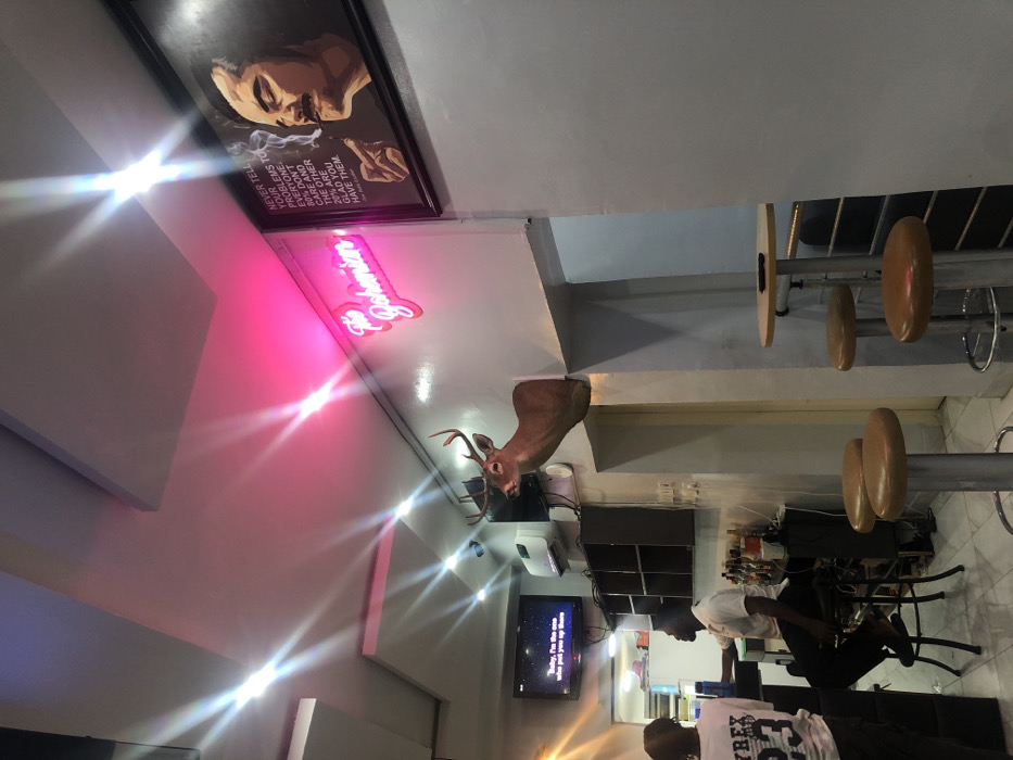 The image depicts a room with a deer head mounted on the wall. Above it, a neon sign with the name "The Bohemains" is visible. Further up, a framed picture of a person smoking with a quote mentioning problems. The setting appears to be a salon or barbershop, with high stools visible in the background. Two individuals are present in the scene, one seated and another standing. A television is mounted on the wall, showing lyrics from a song.