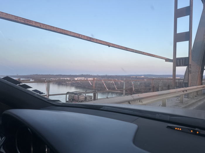 The image provides a forensic view from inside a vehicle, looking forward and slightly right, across the Giurgiu-Ruse Friendship Bridge over the Danube River in Giurgiu, Romania