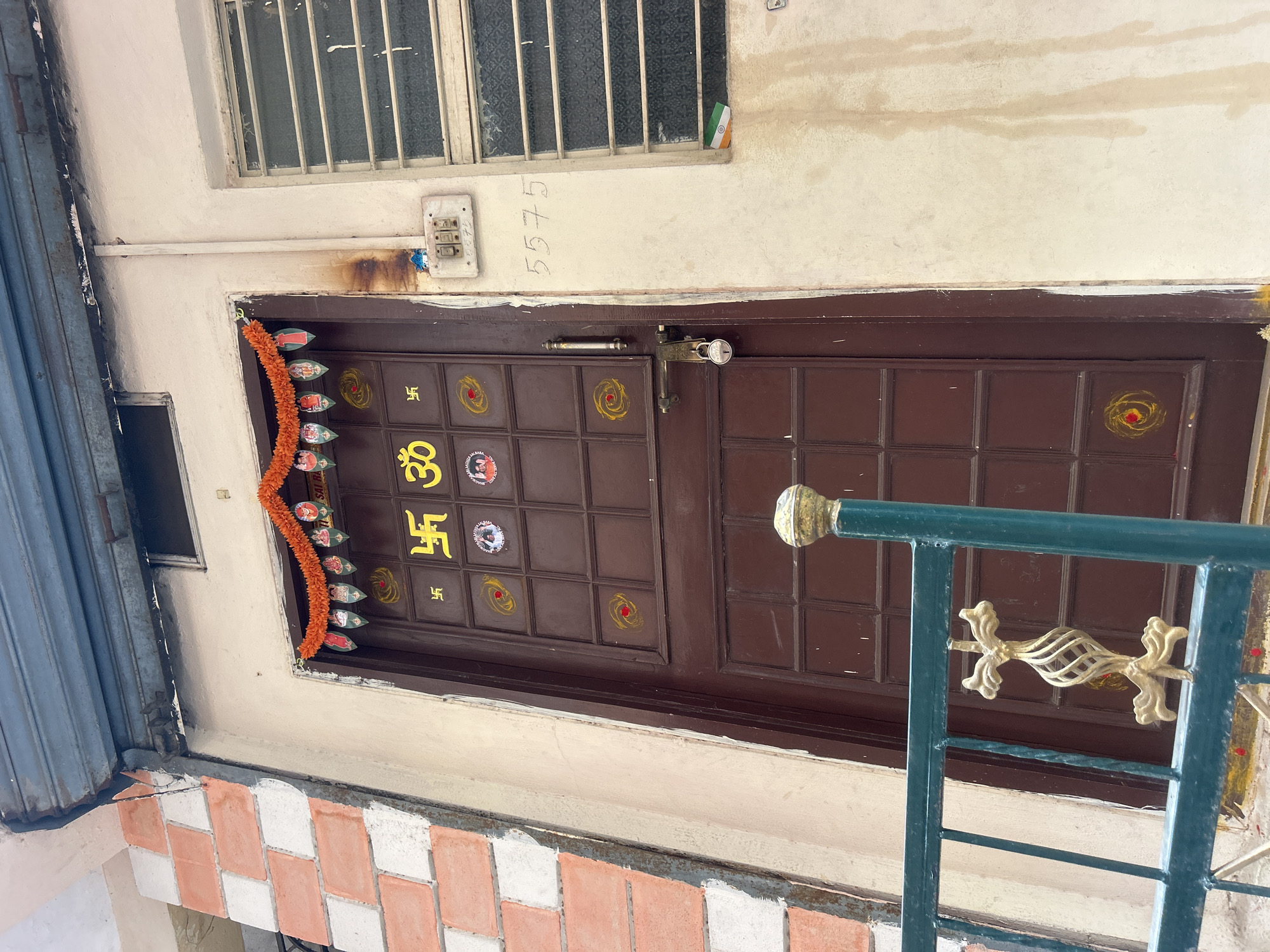 This is an exterior view of a building facade in Puttaparthi, India, depicting a closed door and an adjacent window from a low-angle perspective. The central subject is a dark brown paneled door, likely metal, secured by a gold-colored padlock through a hasp and staple. The door is adorned with yellow religious symbols: a large "Om" (ॐ) symbol in the upper center, flanked by multiple smaller "Swastika" (卍) symbols. Below these are several circular stickers, one of which depicts a religious figure. Some door panels also feature yellow concentric circles with a red central dot. A brass-colored handle is visible on the right side of the door. Above the door frame, an orange and green artificial flower garland is strung, featuring small paper cutouts, one of which clearly displays "SAI RAM." To the immediate right of the door is a cream-colored wall. The numbers "5575" are handwritten onto this wall. Above the numbers, an old, rectangular white electrical switchboard with three switches is mounted, with exposed wiring running vertically upwards. Stains, consistent with water runoff, are visible on the wall below and to the right of the switchboard. Further to the right is a rectangular window with horizontal metal security bars and frosted or patterned glass. A small, folded Indian flag (saffron, white, and green) is tucked into the bottom right corner of the window frame. Above the door and window, a blue-grey corrugated metal rolling shutter is partially visible in an open position. To the left of the door, a section of the building's wall features alternating light orange and white rectangular brickwork. In the immediate foreground, a dark green metal railing with a decorative gold-colored finial and scrollwork element is visible, positioned in front of the door. No people or animals are present.