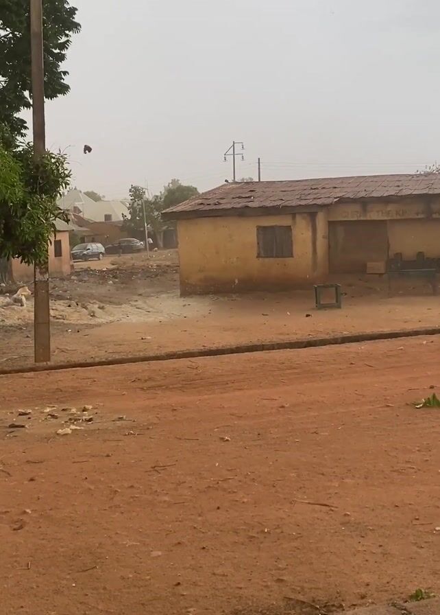 street scene in what appears to be a village or small town with a red dirt road