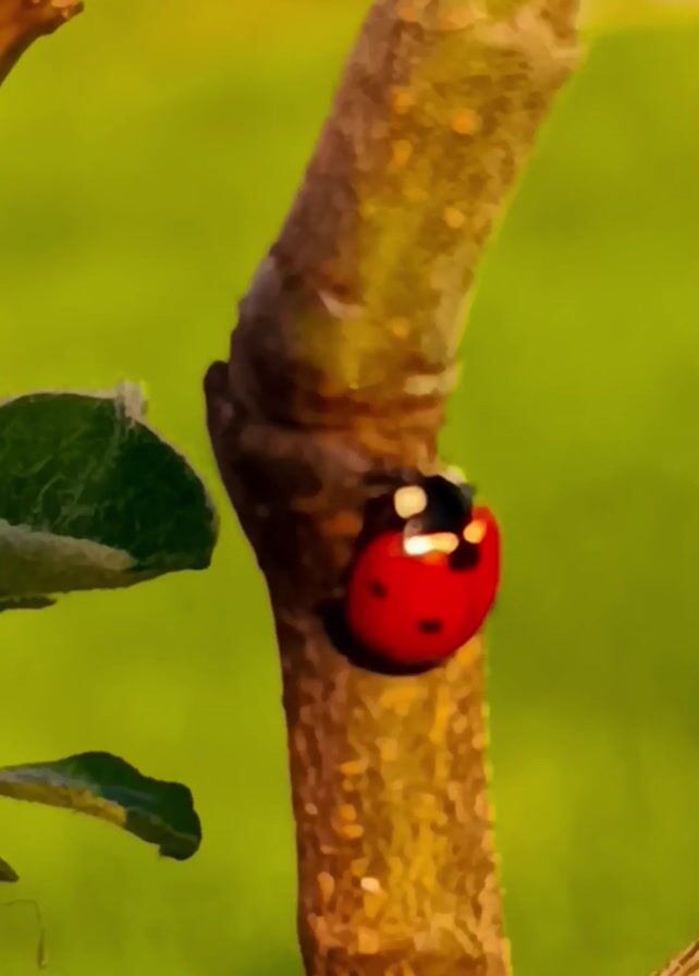 close-up shot of a ladybug on a branch. The ladybug is red with black spots. The branch is brown and has some green leaves. The background is a blurry green. An indiscernible voice briefly speaks in the background.