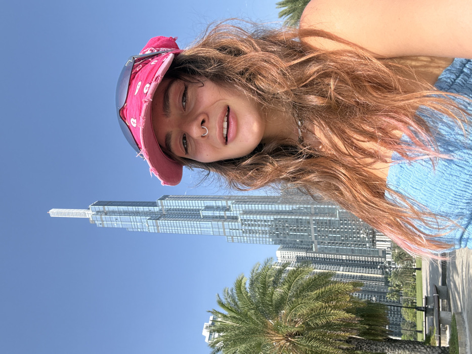 A woman wearing a pink bandana hat and a blue top poses against the backdrop of a towering skyscraper. The building, with its glass facade, dominates the skyline behind her. Palm trees are visible at the bottom of the frame, adding a tropical touch. The bright blue sky provides a clear background, emphasizing the height of the building and the sunny atmosphere. The woman's face is angled towards the camera, and she has a nose ring.