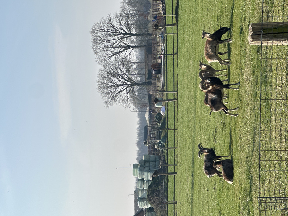 The image depicts a rural scene in Sint Anthonis, Netherlands, under clear skies. In the foreground, a verdant grassy pasture is enclosed by a wire mesh fence with a wooden post visible in the bottom right corner. Seven Mouflon sheep are present in this field. One dark-coated ram with prominent, curved horns stands facing the viewer in the lower-middle left. To its left, a lighter brown sheep is lying on the grass. To the right, another light brown sheep grazes with its head lowered. Several other sheep, including rams with visible horns, are partially obscured or standing further back within the group. In the midground, a wooden fence separates the pasture from a working farm area. This area contains a large pile of dark earth or manure to the left, adjacent to a substantial stack of numerous green-wrapped silage bales. Further right, various agricultural structures are visible, including an open-sided shed, a large spool-like object, and additional wrapped bales. A tall, dark street light pole stands centrally in the midground, with another visible further to the right beneath trees. The background features a sparse treeline dominated by two large, bare deciduous trees, suggesting a winter or early spring season. Distant buildings with dark roofs are partially visible on the far left. The sky overhead is light blue with minimal cloud cover, indicating daylight hours.