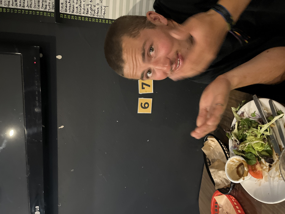 The image depicts an indoor scene in Wombarra, Australia, likely a casual dining establishment or pub. A young adult male with short brown hair and a faint mustache is seated at a wooden table, looking directly at the camera with a slightly open-mouthed expression and his left hand raised near his chin, palm forward. He wears a dark short-sleeved shirt and a blue and multi-colored bracelet on his right wrist. A thin ring is visible on his left ring finger. On the table, a white plate holds the remnants of a salad, consisting of mixed greens, a tomato slice, and a small plastic cup with brown dressing residue. A fork and knife are on the plate. Adjacent to the plate are a black plastic basket and a red plastic basket, both lined with brown paper. The background features a dark wall. Mounted high on the upper left portion of the wall is a black LG television screen. To the mid-right, two yellow square plaques with black numbers "6" and "7" are affixed to the wall. Further to the right, a whiteboard displays a vertical list of handwritten names and numbers, including entries such as "Ellie," "Sean," "Dirie," and "Manny."