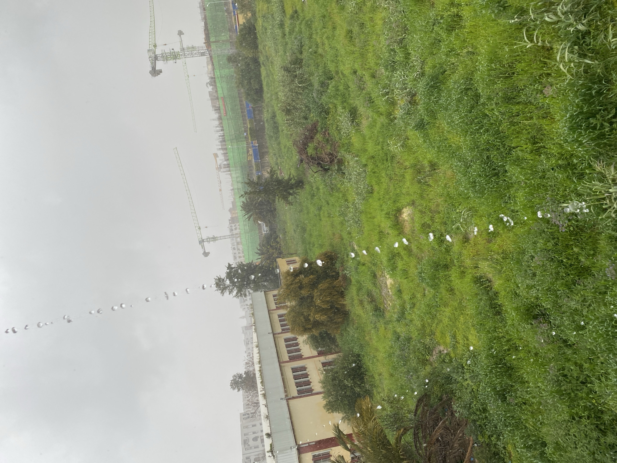n outdoor scene in Baraki, Algeria, likely taken from an elevated position. The weather is overcast, potentially rainy or foggy. In the foreground, there is a stretch of dense green vegetation, primarily consisting of grass and some bushes. Scattered throughout the grass are small white spots. A building with a yellow exterior and red trim is visible in the midground, partially obscured by trees. Further in the background, construction cranes and high-rise buildings indicate a developing urban area. A line of droplets is visible in the air, suggesting either rain or a moisture-related phenomenon.