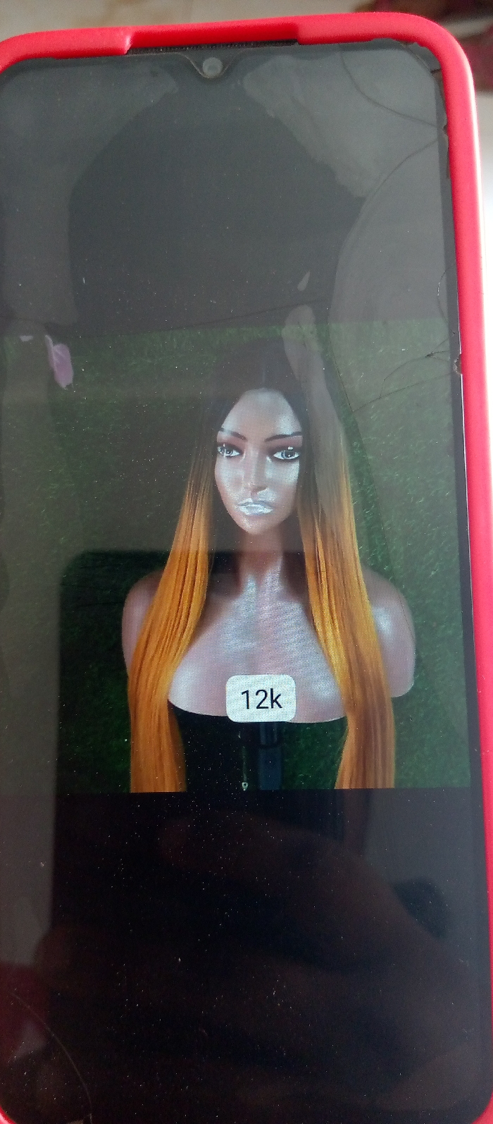 A vertically oriented smartphone, enclosed in a red protective case, displays an image on its screen. The phone's screen exhibits several fine cracks in the upper corners and a teardrop-style notch at the top center. Numerous small dust particles are visible across the screen surface. The displayed image features a dark-skinned female mannequin bust, adorned with a long, straight wig that transitions from black at the roots to a vibrant golden-orange along its length. The mannequin's face presents prominent makeup, including silver lipstick and light-colored eyes. A white, rectangular label with rounded corners, displaying "12k," is overlaid on the mannequin's chest. The background within the displayed image is a blurred green, resembling a textured artificial surface. This scene is located in the city of Ukwu-Abwa, Nigeria.