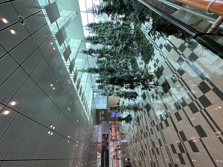 An angled interior shot showcases a modern architectural space. The left features a gray wall with recessed lighting. The right side reveals a patterned floor with square and linear designs. A row of trees lines the space, positioned between the wall and the floor. The ceiling is high and partially visible, featuring a grid-like structure and ambient light. People can be seen in the distance at the far end of the space. A railing appears in the upper right corner.