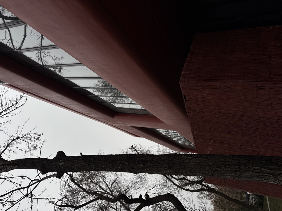 The image displays a low-angle perspective of the Armenian State Puppet Theatre on Sayat-Nova Avenue in Yerevan, Armenia. The prominent structure is a modernist building characterized by its reddish-brown facade. A series of tall, vertical windows are present along the upper visible section, reflecting bare tree branches and an overcast, light gray sky. Below these windows, a darker, reddish-brown screen, possibly of woven material, covers a lower portion of the building's exterior. To the left, a large, leafless tree trunk stands vertically in the foreground, with its bare branches extending upwards. A small patch of green grass is discernible at the lower left edge of the frame. No individuals or active scenes are depicted within the static environment.
