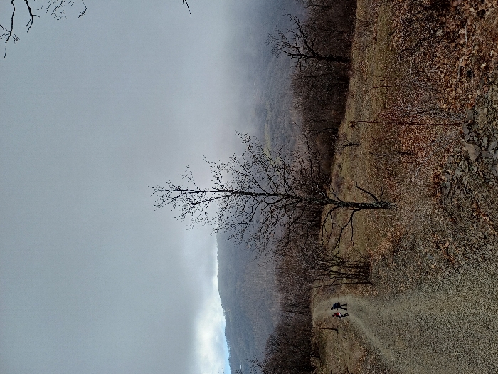 The scene depicts a mountainous landscape near Eleshnitsa, Bulgaria, under an overcast sky. A gravel and dirt path diagonally traverses the image from the lower-left foreground, curving towards the upper-left midground. Two individuals are walking along this path, observed from behind. The person in front wears a dark jacket, dark trousers, and a dark backpack. The person following wears a dark jacket featuring a red component and dark trousers. The terrain flanking the path is covered with sparse, dry brown vegetation, fallen leaves, and scattered rocks. A leafless deciduous tree stands prominently to the right of the path in the midground, with its bare branches reaching into the sky. Other bare trees and dense, leafless shrubs populate the hillsides. In the background, forested mountains are partially obscured by low-hanging mist or clouds, blending into the heavy, grey sky.