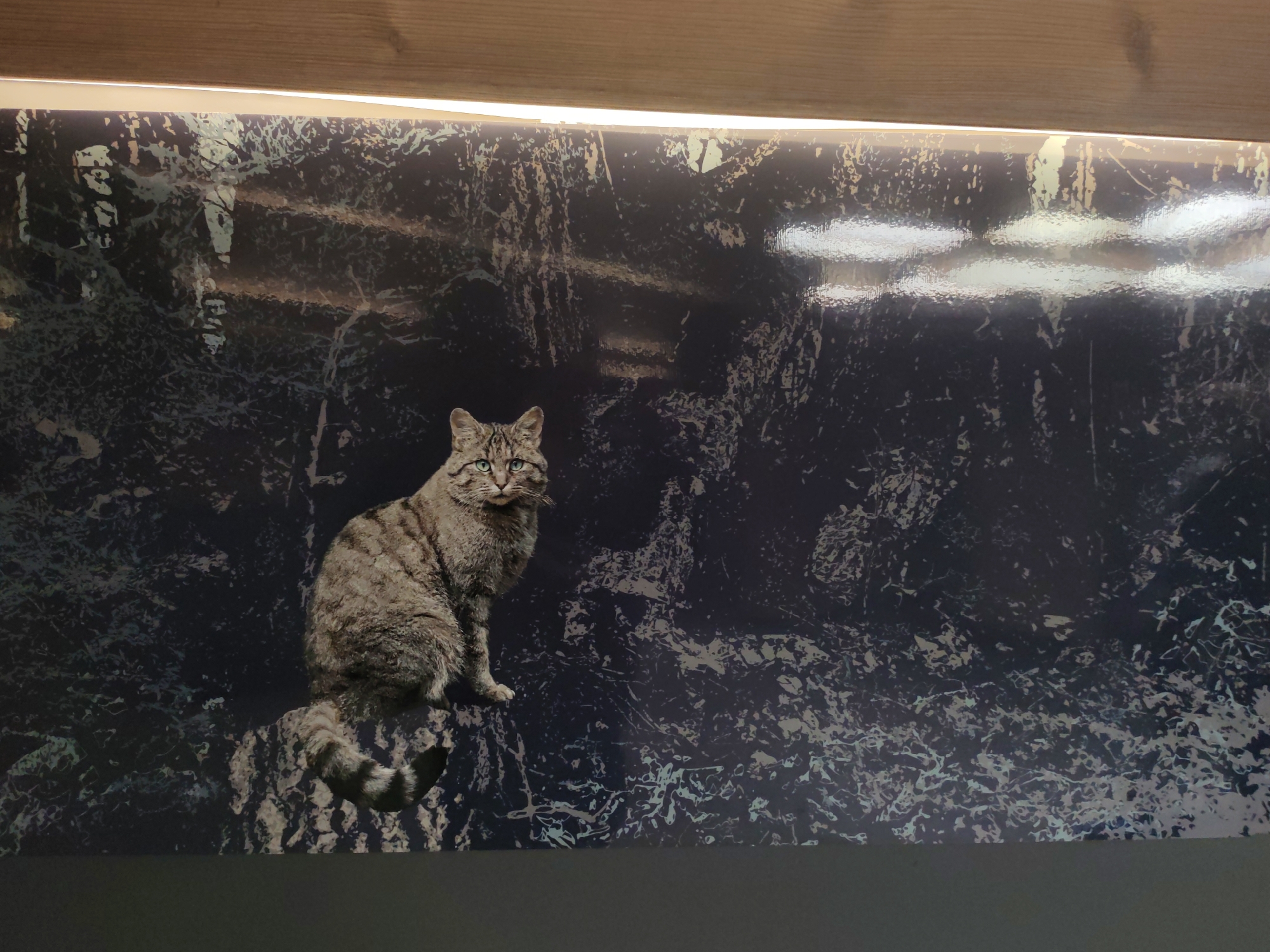 An indoor exhibit within the city of Samokov, Bulgaria, showcases a European wildcat. The central subject is a taxidermy specimen or highly realistic model of a European wildcat (Felis silvestris) with greenish-blue eyes, mottled gray-brown fur displaying subtle tabby stripes, and a thick, ringed tail with a black tip. The wildcat is depicted in a seated position, facing slightly left of center, with its gaze directed forward. It rests on a dark, textured base resembling a rock or fallen log. The background is a large, glossy mural or print featuring an abstract, dark forest scene with lighter, swirling patterns that suggest foliage or dappled light. Horizontal light reflections are visible across the reflective surface of the background, particularly in the upper right quadrant. A horizontal wooden beam spans the top of the frame, partially obscuring the upper edge of the mural, with a narrow, illuminated light strip running beneath it. The bottom of the image shows a solid, dark gray wall or platform. No people are present.