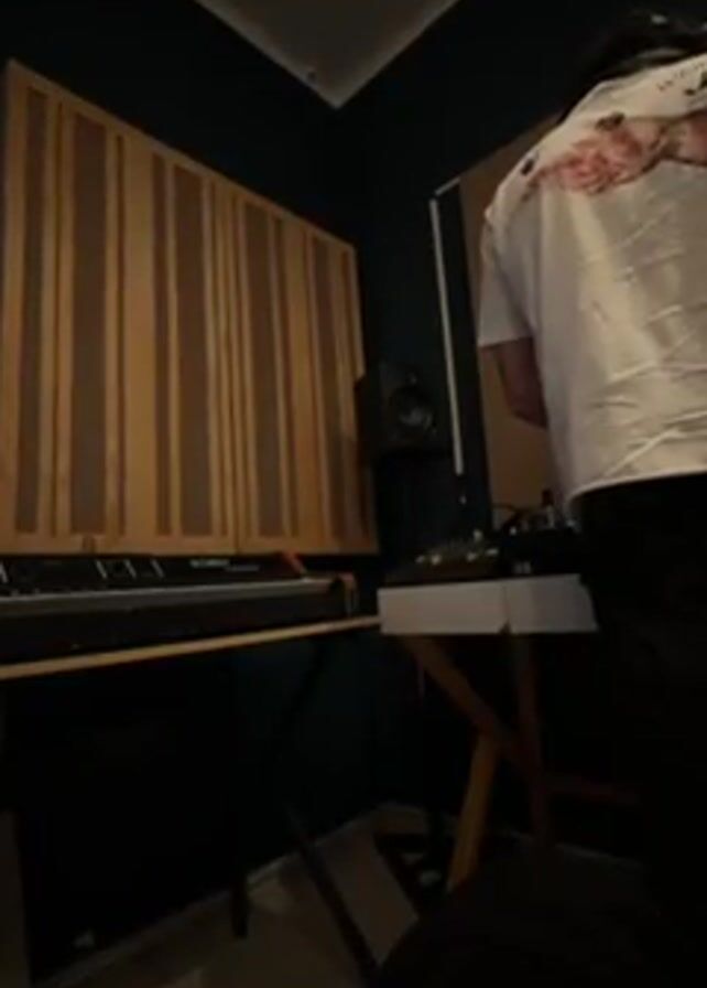A person wearing a white shirt and dark pants is standing in a room, possibly a home studio, and operating electronic music equipment. A keyboard stands on a black metal stand and a white mixing board is on a wooden stand. A dark speaker is visible near the ceiling. There is sound proofing on the walls in the form of a vertical wooden slat. The walls are painted a dark blue.