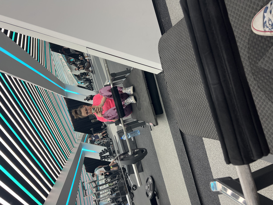 The image displays the interior of a modern fitness facility, identified as a PulsFit gym in Sofia, Bulgaria. In the midground, a female subject is seated on a black padded platform, appearing to be part of a hip thrust machine. She has dark hair tied in a bun, wears glasses, a pink long-sleeved top, patterned purple leggings, and white patterned high-top sneakers. She holds a white smartphone with both hands, focusing on its screen. A barbell with a black weight plate and a blue "PulsFit" branded water bottle rest on the floor to her left. The foreground shows a close-up of a black padded gym bar and the toe of a white patterned canvas shoe, suggesting the perspective is from another piece of gym equipment. The background reveals additional gym patrons exercising, various weight racks, benches, and machines. The facility features a distinctive ceiling with parallel white and teal linear LED lights, creating a striped pattern. White angular architectural elements and dark wall panels are also visible, with reflective surfaces mirroring parts of the gym. The floor is covered with a patterned black and gray rubber matting.