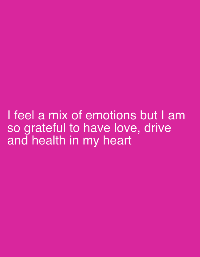 A solid magenta background dominates the image. White text, left-aligned, is situated in the bottom half of the composition. The text reads, "I feel a mix of emotions but I am so grateful to have love, drive and health in my heart." The message conveys a sense of gratitude amidst mixed feelings, highlighting the importance of love, motivation (drive), and well-being (health).