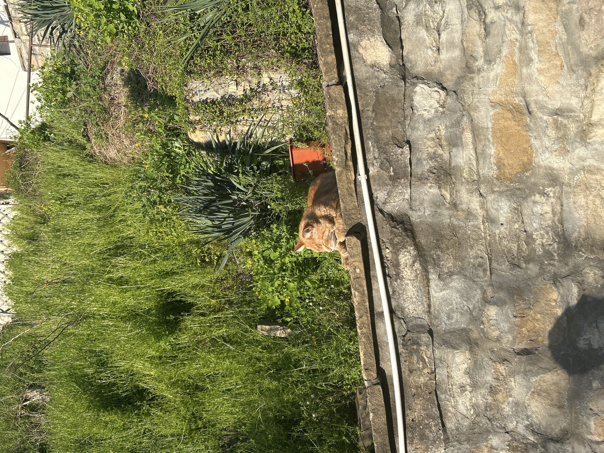 The image captures a scene in Veliko Tarnovo, Bulgaria. A ginger cat is perched on a low stone wall, looking down into a garden area filled with lush green grass and various plants. A terracotta pot sits amongst the foliage. A white pipe runs vertically along the wall. The wall itself is made of irregular stones, showing signs of age and weathering. To the left of the wall is thick vegetation, and in the distance, a glimpse of a white building is visible. The photo is taken from an elevated position, looking down onto the scene. The sun is shining brightly, creating shadows on the wall and highlighting the textures of the stone and vegetation.