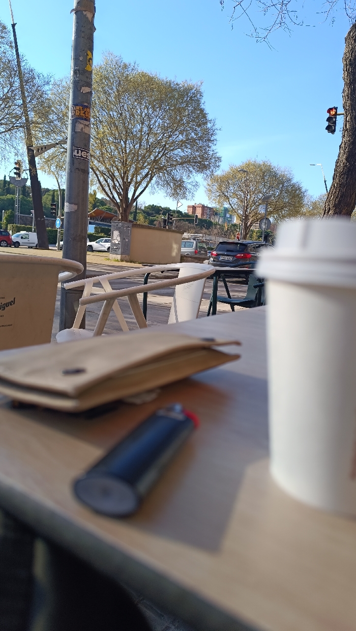 The scene depicts an outdoor cafe patio on a clear, sunny day in Sabadell, Spain. In the immediate foreground, a light-colored wooden table surface is visible. On this table, a white disposable coffee cup with a lid is positioned on the right, blurred. To its left, a folded brown paper object rests, and further left, a black cigarette lighter with a red accent is present, also blurred. In the midground, beyond the table, an empty light-colored, possibly wooden, outdoor chair with a distinctive curved backrest is visible. To the left, a large tan box with "San Miguel" branding is partially seen next to another table. A prominent grey utility pole, covered with multiple stickers, stands vertically in the center-left. Beyond the patio, a paved street is visible with vehicular traffic. A white van is seen on the far left, and a dark-colored SUV, bearing a partial license plate of "2110 CSS" on its rear, is parked or moving on the right side of the street. Other vehicles are visible in the distance. Traffic lights are present, with one on the far right displaying a red signal, and others further back showing green. Low, light-colored walls or barriers separate the patio from the street. The background consists of a clear, bright blue sky. Numerous deciduous trees with sparse, light-green foliage are scattered throughout. Elevated terrain and distant buildings, including a visible brown structure, are present beyond the street and trees. Strong natural sunlight illuminates the scene, creating discernible shadows. No individuals are depicted.
