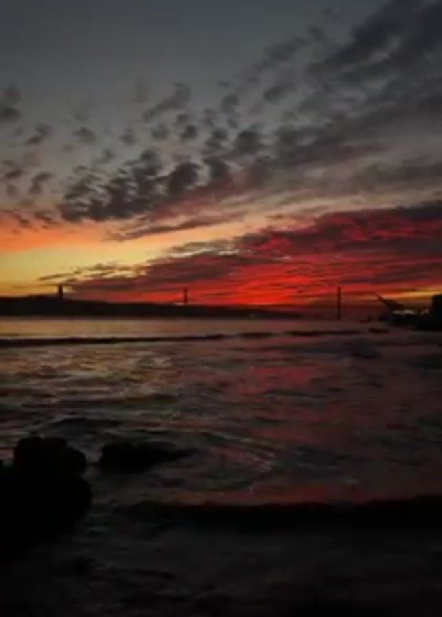sunset over the ocean. The sky is a mix of dark gray, orange, and red hues, with some patchy clouds. In the distance, a bridge and a lighthouse are visible. The waves are gently rolling in, reflecting the colors of the sky. Some rocks are visible in the foreground.