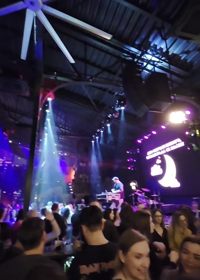 crowded nightclub with a band performing on stage. The stage is lit with green, blue, and purple lights, and a large screen displays an image of a crescent moon and text in a language that is not discernible. A large ceiling fan with multiple blades is visible in the foreground. The crowd is composed of people of various ages, with many holding drinks. Some are smiling and talking, while others are looking at the stage. A man is wearing an Iron Maiden t-shirt. The atmosphere is lively and energetic.