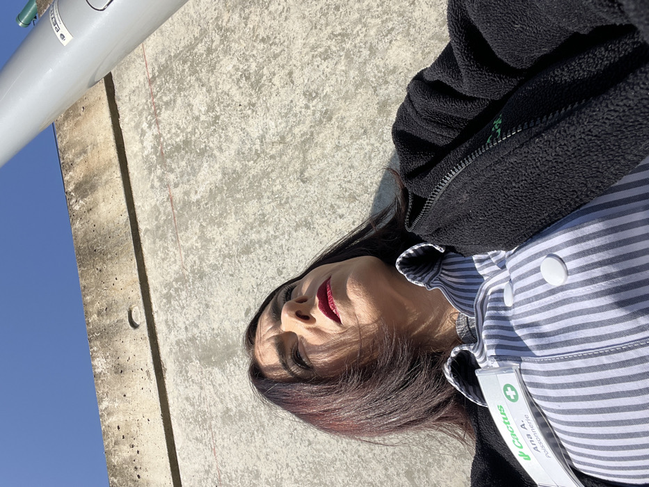 A female subject is depicted in a medium, low-angle shot, gazing upwards and to the right. She has dark hair with reddish undertones, red lipstick, and a furrowed brow, illuminated by direct sunlight which casts pronounced shadows. She wears a white and grey vertical striped shirt underneath an unzipped black fleece jacket. A white name tag pinned to her left chest features a green 'Cactus' logo, the name 'Ana A.', and the department 'Poissonnerie'. The background comprises a textured light grey concrete wall with a darker horizontal upper edge and a faint red line. Above the wall is a clear blue sky. On the right, a light grey cylindrical pole with a visible 'PETRO' label extends vertically, partially obscuring a small green object in the upper right. The scene is located in Niederanven, Luxembourg.